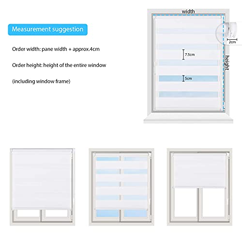 Dimensioni: 55 x 130 cm. La larghezza delle tende zebrate è di circa 4 cm più corta della larghezza dell'ordine. Si prega di misurare il vetro della finestra e la larghezza della finestra prima dell'acquisto. Larghezza dell'ordine = larghezza del vetro + ~ 4-6 cm. Ad esempio: per un bicchiere da 76 cm, devono essere acquistate tende a rullo larghe 80 cm. Si prega di notare che la larghezza dell'ordine non deve superare la maniglia.