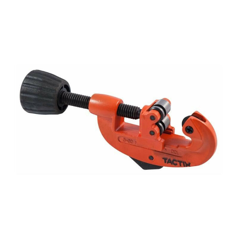 Tagliatubi Tactix 3-30 mm Tagliatubi Tactix 3-30 mm Tagliatubi compatto per lavorare in spazi ristretti Ruota scanalata per una presa sicura e antiscivolo e un serraggio preciso. I rulli scanalati consentono tagli vicino alle estremità svasate Adatto per tubi di rame, ottone e alluminio. Per tubi da 3-30mm