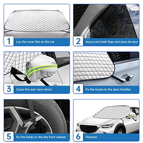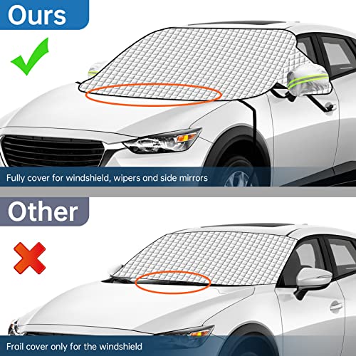 【Dimensioni ampliate, anti infiltrazioni!】Abbiamo ampliato le ali laterali, in modo da poter coprire parte del parabrezza per evitare infiltrazioni d'acqua o di neve nell'auto dal finestrino laterale. Abbiamo anche esteso la parte anteriore per proteggere completamente i tergicristalli. Inoltre, include coperture di protezione per gli specchietti retrovisori per ottenere una protezione completa dell'auto.