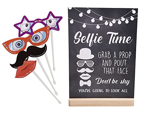 Segnale autosufficiente: perfetto da posizionare su un tavolo vicino alla cabina fotografica o al set di puntelli, affinché i tuoi ospiti possano scattare foto divertenti memorabili. Stampato con 'Selfie Time. Prendi un puntello e fai il broncio quella faccia. Non essere timido, guarderai asso