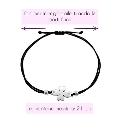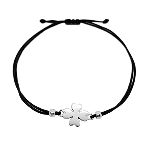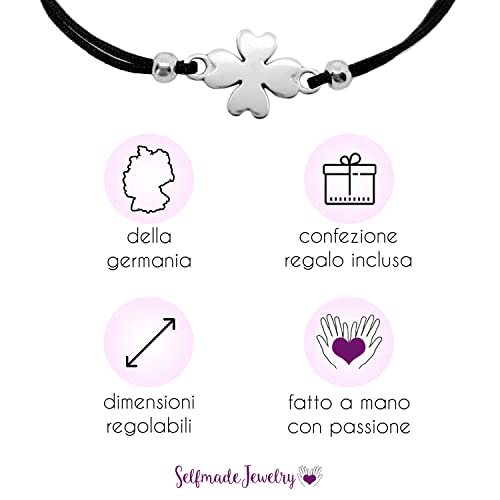 Selfmade Jewelry Bracciale Portafortuna per Donna - Bracciale A Quadrifoglio su Nastro Nero - Gioielli Portafortuna per Donne e Ragazze Fatti a Mano In Germania (Argento)(Taglia Regolabile)