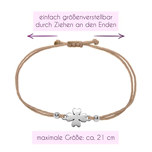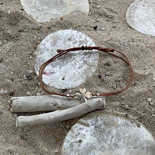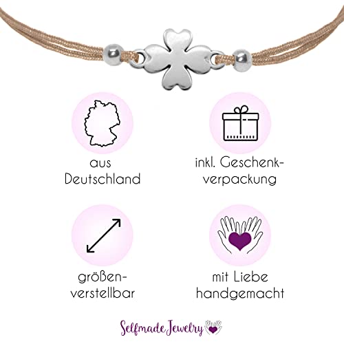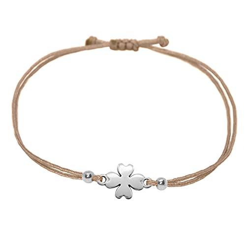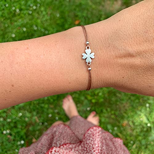 Selfmade Jewelry Bracciale Trifoglio Argento per Donna, Bracciale Portafortuna con Trifoglio Regolabile a Mano Inclusa Confezione Regalo (Argento - Marrone)