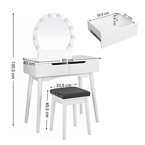Selsey Derra - Tavolino da toeletta con due cassetti, specchio rotondo e sgabello, larghezza 80 cm, colore: Bianco