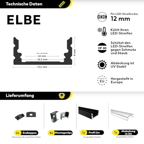 Contenuto della confezione: copertura SEMI 200 cm + 200 cm strisce LED in alluminio per strisce LED (senza accessori - ma qui disponibili) - Dimensioni del prodotto: 200 cm (lunghezza), 17,1 mm (larghezza) e 8 mm (altezza) - Guida LED in alluminio adatto per strisce luminose RGB RGBW fino a 12 mm