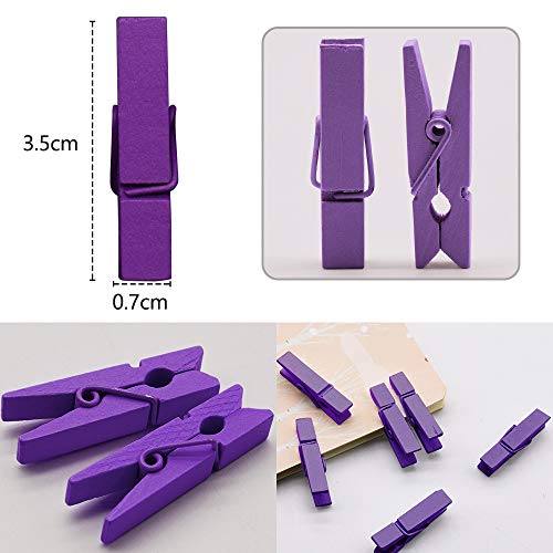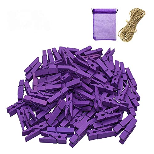 SENDILI Mollette Legno Piccole - 3.5 CM Colorate Foto da Parete Matrimoni Compleanno Feste Biglietti Memo Fai da Te Decorative Clip con 10 Metri Spago, Viola