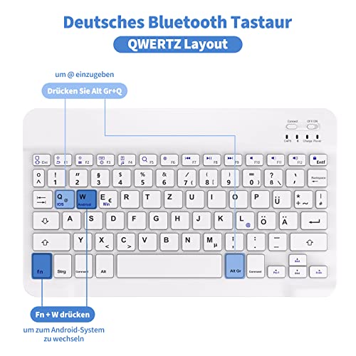 [Tastiera Bluetooth con layout QWERTZ] - L'altezza della tastiera è di soli 8 mm e il peso è di 200 g, la ricarica dura 2 ore con una carica completa. La tastiera bianca è molto carina e permette di digitare rapidamente senza rumori.