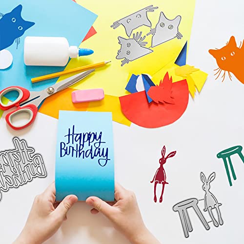 Imballaggio: riceverai tre set di fustelle da taglio in metallo, tra cui una forma a coniglio, una forma a gattino e una fustella da taglio in metallo con scritta "Happy Birthday".