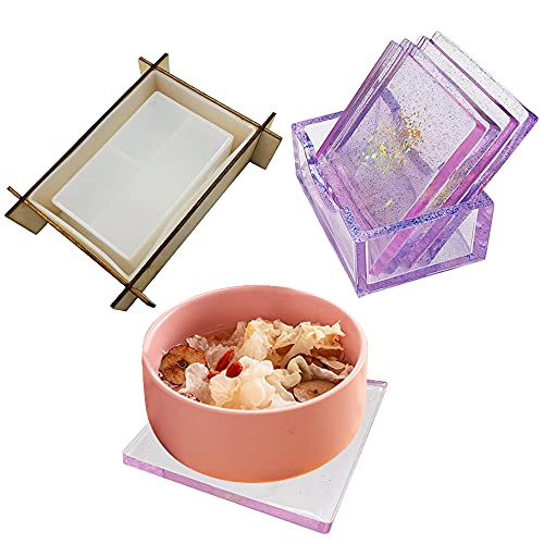 Senhai, 4 stampi quadrati in silicone per sottobicchiere, supporto in legno e 1 tappetino in silicone per fai da te per tazze, colata in resina, sottobicchieri per bevande