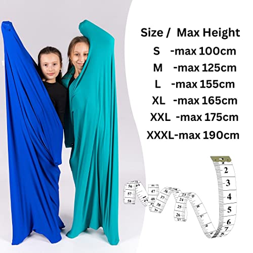 La taglia S è ideale per i bambini fino a 100 cm di altezza, la calza dovrebbe poggiare sulle spalle. Lycra si allunga in modo appropriato, ma si stringe anche - questa è una funzione terapeutica - il bambino deve lavorare con il materiale, come lavorare con una fascia da ginnastica. Body Sock esercita i muscoli e ha un effetto positivo sul sistema osseo e articolare, calma e calma il sistema nervoso.