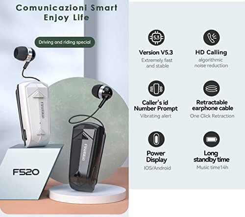 SENSSON F520 - Auricolari Bluetooth Smartphone Con Clip - Filo Retrattile In Ear - Avviso a Vibrazione integrata - Microfono Cancellazione Attiva Del Rumore