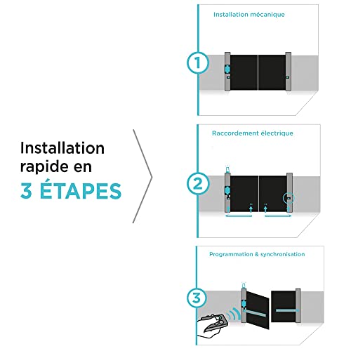 Semplice installazione in 3 fasi: basta installare meccanicamente questa motorizzazione del cancello a battente, collegarla elettricamente per alimentarla, quindi programmarla e sincronizzarla senza difficoltà per il massimo comfort