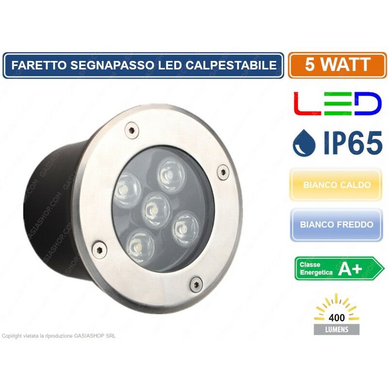Segnapasso LED da interramento, con potenza di 5W. Forma circolare con controcassa in plastica nera, copertura dei LED trasparente e corona di colore argento satinato. LEDSMD con flusso luminoso di 400 lm. Ideale per l'illuminazione di piante e cortili, e grazie al grado di protezione IP65, è adatto a resistere per molto tempo interrato ed esposto alle intemperie. Dotato dicassero estraibile per un facile interramento. Questo modello di segnapasso è disponibile con due differenti gradazioni di luce: Luce Bianca Fredda 6500K e Bianca Calda 3000K Dimensioni: Ø 120 x 93 mm.