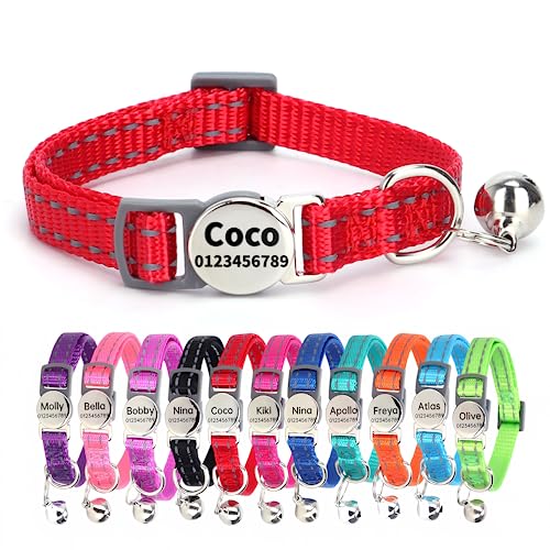 SEOUGEE Collare per gatti a sgancio rapido con targhetta con nome personalizzato, collari riflettenti per gattini con campanelli e rilascio di sicurezza, regolabile 19-30 cm, rosso