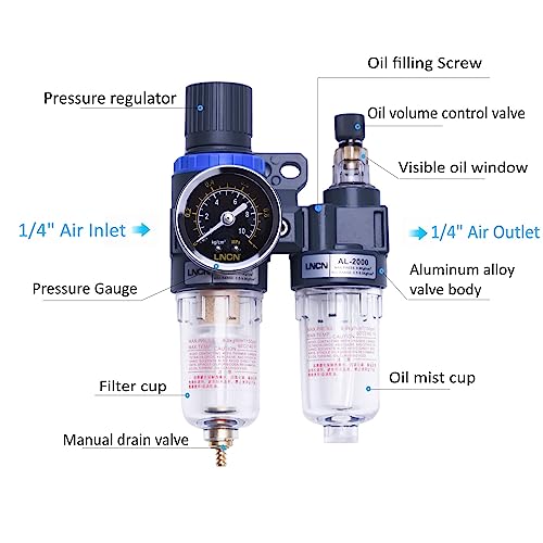 Questo regolatore del filtro dell'aria può rimuovere particelle solide e condensa con aria compressa e preparare adeguatamente aria per molti tipi di utensili pneumatici e attrezzature.