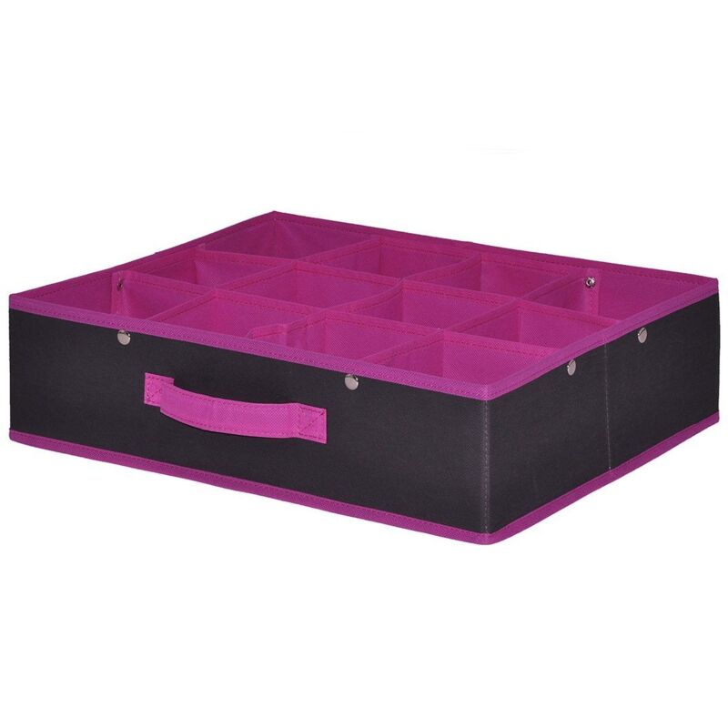 Questo separatore di cassetto flessibile con 12 scomparti, da posizionare in un cassetto di uno scaffale o di una cassettiera o da far scorrere su uno scaffale, ti permetterà di ottimizzare l'organizzazione del tuo interno. Ideale per la biancheria intima, i calzini, gli accessori come sciarpe e cinture, questo separatore di cassetto flessibile con 12 scomparti è facile da assemblare grazie a un fondo rigido pieghevole in cartone rivestito di tessuto non tessuto. Il separatore si fissa con bottoni a pressione su entrambi i lati. Colore: esterno grigio antracite, rifinitura dei bordi contrastante rosa fucsia, interno fucsia. Materiale: cartone e tessuto non tessuto. Dimensioni: L 45 x P 36 x H 12 cm.
