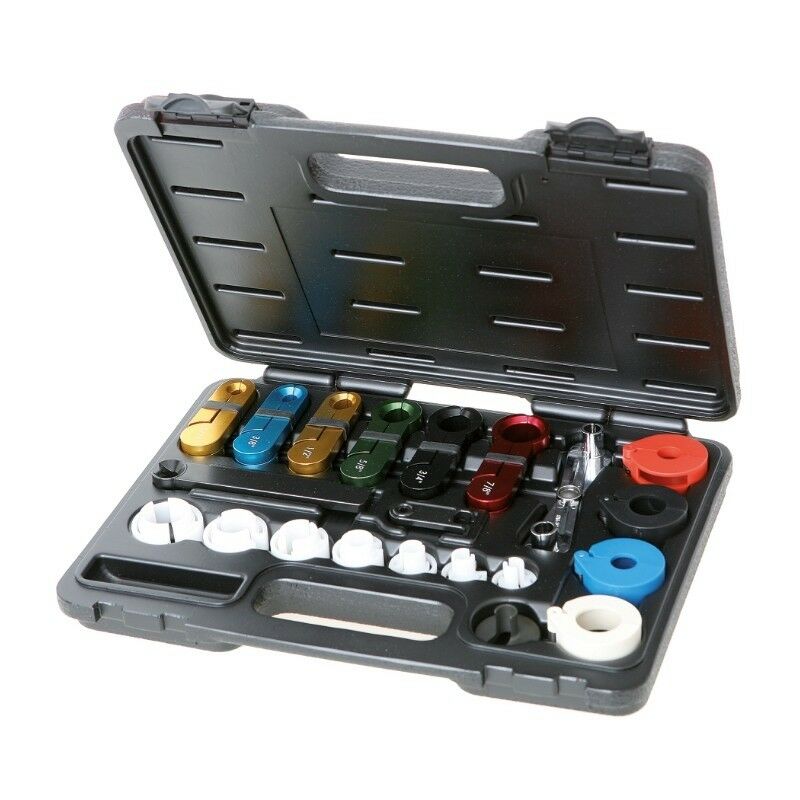 KIT SCOLLEGAMENTO RACCORDI CONDIZIONATORI 1483K/22 Articolo: Beta 1483K/22 Codice: 014830022 Kit per la separazione di raccordi su impianti di condizionamento, alimentazione e lubrificazione Dimensioni valigetta: 300x230x55 mm CAMPO D'UTILIZZO: Il set per la separazione di raccordi su impianti di condizionamento, alimentazione e lubrificazione è utilizzabile sul principale parco circolante di vetture prodotte in Europa, America ed Asia. CONTENUTO DEL SET: 1 - Sei utensili in alluminio, con codice cromatico, per scollegare impianti di condizionamento, alimentazione e lubrificazione. Misure: 5/16”, 3/8”, 1/2”, 5/8”, 3/4”, 7/8” 2 - Sette utensili in plastica bianca per scollegare impianti di condizionamento e di alimentazione. Misure: 1/4”, 5/16”, 3/8”, 1/2”, 5/8”, 3/4”, 7/8” Adatto per giunti a molla montati su impianti di condizionamento Opel, Ford, GM, Chrysler. Utilizzabile anche per impianti di alimentazione e per innestare tubazioni radiatore. 3 - Quattro utensili in plastica con