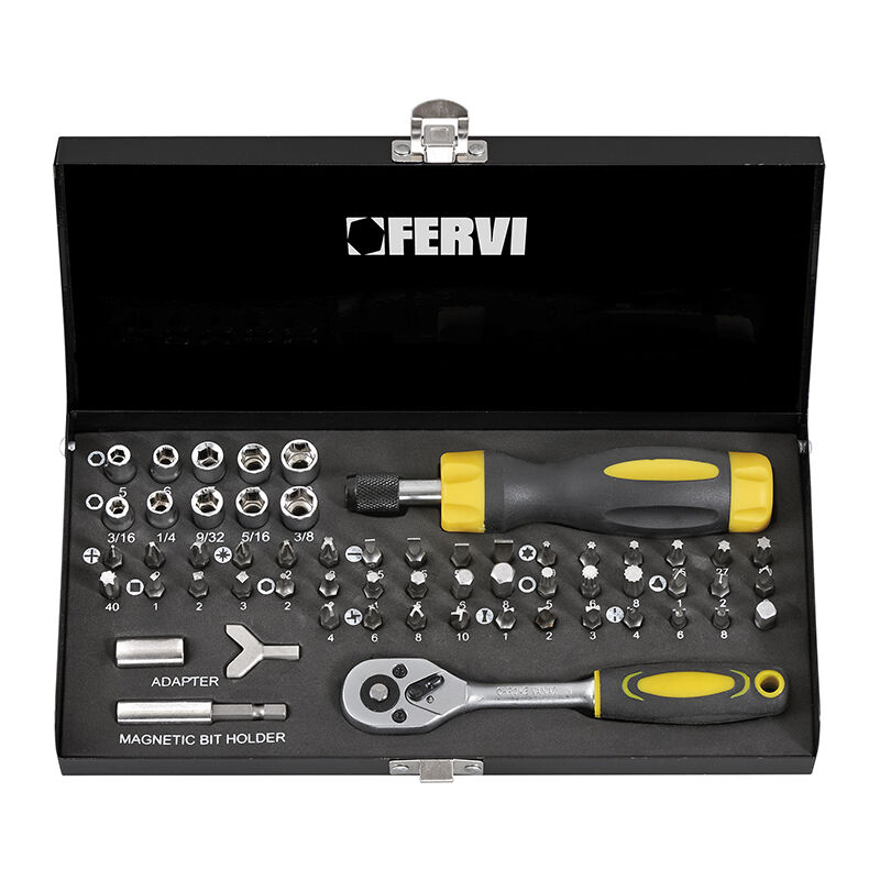 Serie di bussole e inserti con giravite e cricchetto reversibile 1/4 Fervi