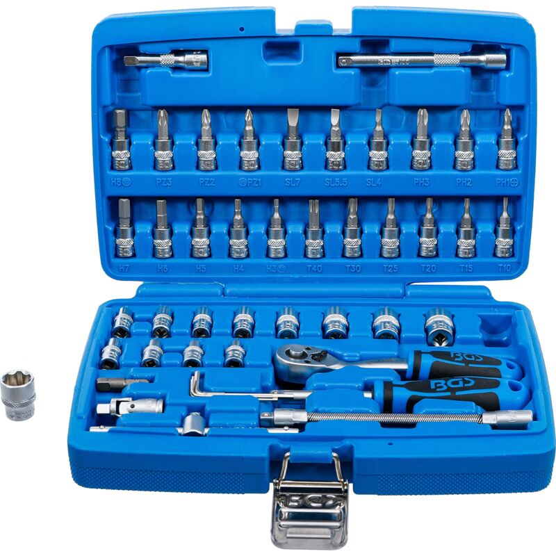 Profili a T (per Torx) senza foro Oggetto della fornitura: 1 adattatore esagono esterno 6,3 mm (1/4) - quadro esterno 6,3 mm (1/4) 1 impugnatura portabussole 2 prolunghe 50 + 100 mm 1 snodo con molla 1 impugnatura scorrevole 1 prolunga flessibile 1 cricchetto reversibile, dentatura fine, 72 denti 3 chiavi ad angolo a L, esagono interno 1,5 - 2 - 3 mm 6 portainserti profilo a T (per Torx) senza foro: T10 - T15 - T20 - T25 - T30 - T40 6 portainserti esagono interno: 3 - 4 - 5 - 6 - 7 - 8 mm 3 portainserti con intaglio piatto 4 - 5,5 - 7 mm 3 portainserti con intaglio a croce PH:: PH1 - PH2 - PH3 3 portainserti con intaglio a croce PZ:: PZ1 - PZ2 - PZ3 13 inserti per bussole Super Lock, 6,3 mm (1/4): 4 - 4,5 - 5 - 5,5 - 6 - 7 - 8 - 9 - 10 - 11 - 12 - 13 - 14 mm Peso del tessuto 1.37 Dimensioni dell'imballaggio 1 Peso lordo 1370 g Materiale (F) Chrom-Vanadium-Stahl