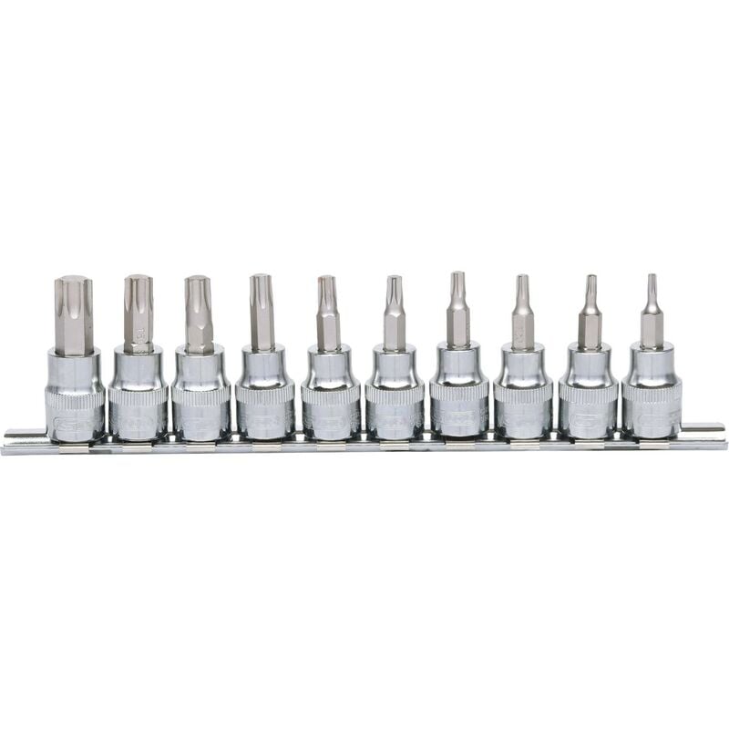 Torx Attacco quadro femmina a norma DIN 3120 / ISO 1174 con sede per sfera di tenuta Con inserto nichelato inserito a pressione Per utilizzo manuale Cromate lucide Cromo-vanadio Fornite con supporto Azionamento quadro in pollici 3/8 Standard DIN 3120, ISO 1174 Profilo 1 Torx Pezzi in set 10 Peso del tessuto 410 Imballaggio Clipleiste aus Metall Dimensioni dell'imballaggio 1 Forma gerändelt Materiale1 Feinster Chrom Vanadium Stahl, hochglanz verchromt