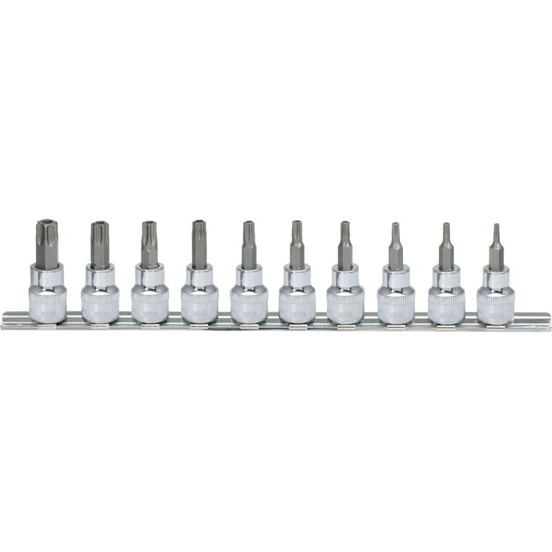 Torx con foro Attacco quadro femmina a norma DIN 3120 / ISO 1174 con sede per sfera di tenuta Con inserto nichelato inserito a pressione Per utilizzo manuale Cromate lucide Cromo-vanadio Fornite con supporto Azionamento quadro in pollici 3/8 Standard DIN 3120, ISO 1174 Profilo 1 Torx mit Stirnlochbohrung Pezzi in set 10 Peso del tessuto 400 Imballaggio Clipleiste aus Metall Dimensioni dell'imballaggio 1 Forma gerändelt Materiale1 Feinster Chrom Vanadium Stahl, hochglanz verchromt