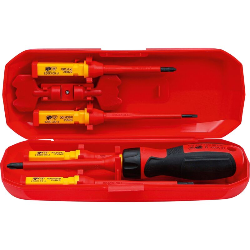 Set compatto di utensili VDE (non solo) per elettricisti per lavori in luoghi diversi come cantieri, impianti solari e quadri elettrici presa sicura delle lame nell'impugnatura, bloccaggio automatico contro l'estrazione involontaria lame intercambiabili con diametri lama ridotti fino a lame tonde ciò significa che possono essere raggiunti e azionati anche elementi a vite e a molla in profondità con 2 chiavi per aprire/chiudere le serrature dei quadri elettrici tutti gli utensili al sicuro e organizzati in una robusta e maneggevole valigetta di plastica perfetto per l'impiego mobile impugnatura dalla forma ergonomica testato secondo la norma DIN EN/IEC 60900 Oggetto della fornitura: 1 impugnatura VDE con portalama intercambiabile, bicomponente (rosso/giallo) 3 lame intercambiabili, a taglio SL 1,0 x 5,5 mm, SL 0,8 x 4,0 mm, SL 0,5 x 3,0 mm, lunghezza lama 100 mm 1 lama intercambiabile, intaglio a croce PH2, lunghezza lama 100 mm 1 lama intercambiabile, intaglio a croce PH1, lunghezza
