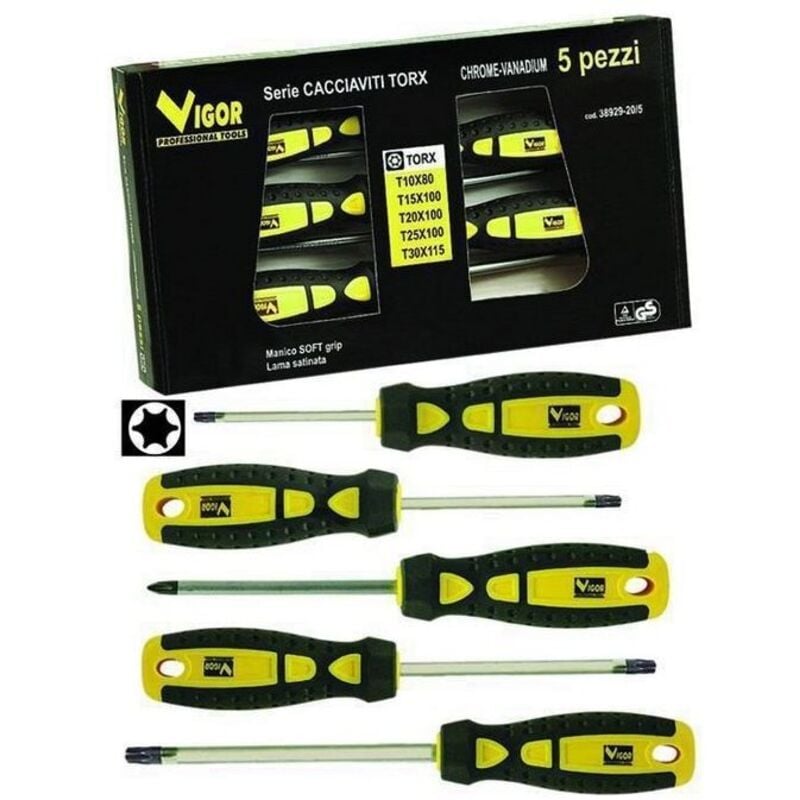 Serie cacciaviti vigor torx cromo-vanadio impugnatura ergonomica gommata lama cromo-vanadio satinata t10x80 t15x100 t20x100 t25x100 t30x115