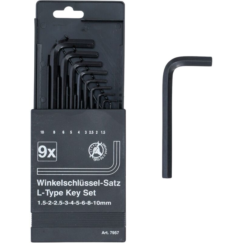 In cassetta di plastica Oggetto della fornitura: Chiave ad angolo con esagono incassato 1,5 mm, lunghezza della lama (lato corto): 15 mm, lunghezza lama (lato lungo): 45 mm Chiave ad angolo con esagono incassato 2 mm, lunghezza della lama (lato corto): 18 mm, lunghezza lama (lato lungo): 52 mm Chiave ad angolo con esagono incassato 2,5 mm, lunghezza della lama (lato corto): 21 mm, lunghezza lama (lato lungo): 52 mm Chiave ad angolo con esagono incassato 3 mm, lunghezza della lama (lato corto): 22 mm, lunghezza lama (lato lungo): 65 mm Chiave ad angolo con esagono incassato 4 mm, lunghezza della lama (lato corto): 28 mm, lunghezza lama (lato lungo): 72 mm Chiave ad angolo con esagono incassato 5 mm, lunghezza della lama (lato corto): 32 mm, lunghezza lama (lato lungo): 82 mm Chiave ad angolo con esagono incassato 6 mm, lunghezza della lama (lato corto): 38 mm, lunghezza lama (lato lungo): 95 mm Chiave ad angolo con esagono incassato 8 mm, lunghezza della lama (lato corto): 44 mm