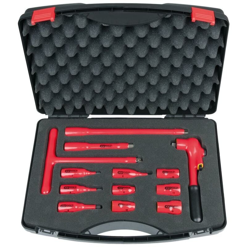 Con rivestimento isolante a norma IEC 60900 Cromo-vanadio In robusta valigetta di plastica Azionamento quadro in pollici 3/8 Dente 32 Standard IEC 60900 Attributo di funzione 1 VDE Pezzi in set 13 Profilo 1 6-Kant Peso del tessuto 2564 Imballaggio Kunststoffkoffer, extra robust Certificato di prova 1000Volt GS Dimensioni dell'imballaggio 1 Materiale1 Spezial-Werkzeugstahl Isolamento Tauchisolierung nach DIN EN 60900