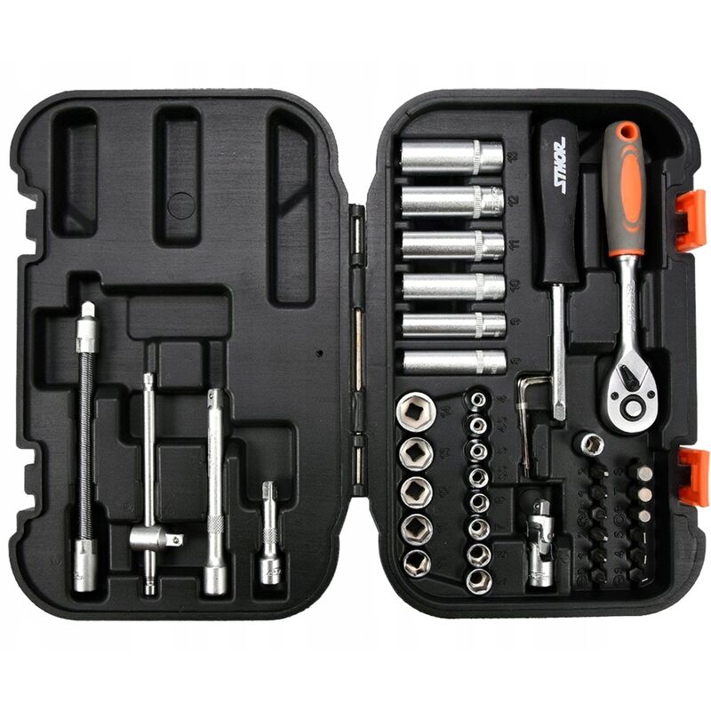 Il set di attrezzi è composto da 42 elementi alloggiati in una pratica valigetta in plastica. Gli strumenti sono stati realizzati con precisione con materiali che ne garantiscono l'affidabilità. Il set comprende un assortimento completo di bussole da 1/4, prolunghe, giunti cardanici e molti altri articoli tra cui un cricchetto a 45 denti. Questa configurazione rende il set adatto a piccoli lavori di assemblaggio, riparazioni meccaniche e molti altri lavori in casa o in officina. Un set per i fai-da-te esigenti Bussole corte da 1/4: 4;