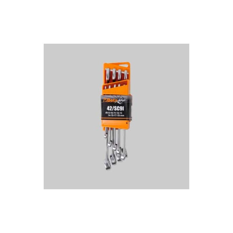 In acciaio al cromo vanadio. Finitura cromata. Testa ad anello inclinata di 15ø. A norma DIN 3113 UNI-ISO 7738. Completa di supporto compatto. Serie chiavi combinate art. 42/sc9i beta 9 pezzi - 8÷19 mm BETA Utensileria beta