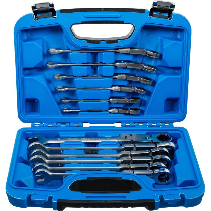 Per aree di lavoro difficili da raggiungere negli spazi più ristretti e collegamenti a vite profondi design snello testa ad anello con cricchetto con doppio snodo una testa ad anello a cricchetto girevole a 180° in continuo Dentatura fine con 72 denti versione metrica angolo di funzionamento: 5° Oggetto della fornitura: 1 chiave combinata a cricchetto con doppio snodo | regolabile | 8 mm, lunghezza 162 mm (BGS 6168) 1 chiave combinata a cricchetto con doppio snodo | regolabile | 9 mm, lunghezza 162 mm (BGS 6169) 1 chiave combinata a cricchetto con doppio snodo | regolabile | 10 mm, lunghezza 179 mm (BGS 6170) 1 chiave combinata a cricchetto con doppio snodo | regolabile | 11 mm, lunghezza 203 mm (BGS 6171) 1 chiave combinata a cricchetto con doppio snodo | regolabile | 12 mm, lunghezza 223 mm (BGS 6172) 1 chiave combinata a cricchetto con doppio snodo | regolabile | 13 mm, lunghezza 223 mm (BGS 6173) 1 chiave combinata a cricchetto con doppio snodo | regolabile | 14 mm, lunghezza 245