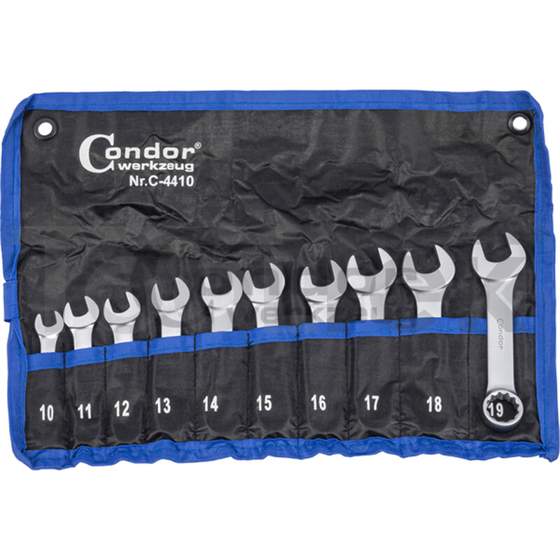 Serie 10 chiavi combinate serie corta CONDOR CARATTERISTICHE: Tipo: extra corta Misure: 10, 11, 12, 13, 14, 15, 16, 17, 18, 19 mm Materiale: acciaio cromo vanadioRifinitura: satinata Prodotto di qualità LA FATTURA VIENE EMESSA PER IMPORTI SUPERIORI A € 20 E VA RICHIESTA AL MOMENTO DELL'ACQUISTO