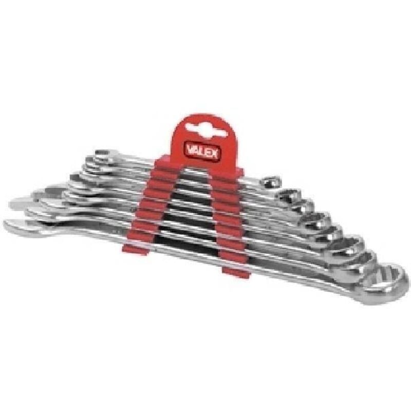 Chiavi combinate serie 8 pezzi Valex corpo in acciaio, misure da 8 a 22 mm CARATTERISTICHE Misure: 8-10-11-13-14-17-19-22mm Teste inclinate di 15° Corpo in acciaio Finitura satinata Supporto in plastica