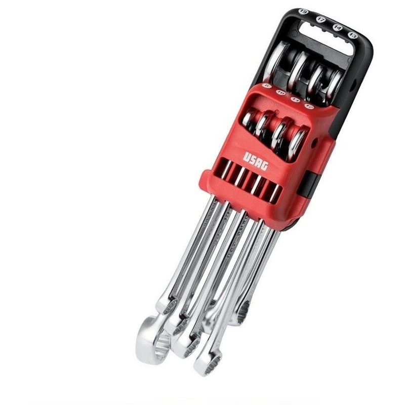 SERIE DI 8 CHIAVI COMBINATE - Chiavi contenute nel set: 8-10-11-12-13-14-17-19 mm - Forchetta ribassata inclinata di 15° - Impugnatura ergonomica - Testa poligonale disassata e piegata di 15° - Fornita con supporto in materiale plastico