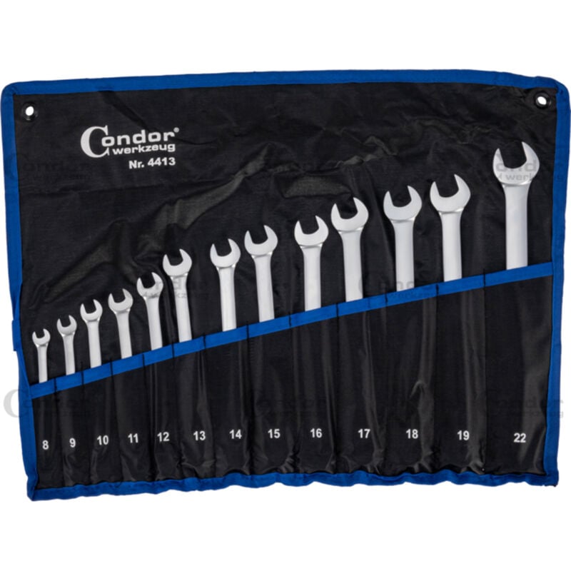 Serie 13 chiavi combinate extra lunghe CONDOR CARATTERISTICHE: Tipo: extra lunghe Misure: 8, 9, 10, 11, 12, 13, 14, 15, 16, 17, 18, 19, 22 mm Materiale: acciaio cromo vanadioFinitura satinata N.B. Il colore della sacca che le contiene potrebbe variare a seconda della fornitura Prodotto di qualità LA FATTURA VIENE EMESSA PER IMPORTI SUPERIORI A € 20 E VA RICHIESTA AL MOMENTO DELL'ACQUISTO