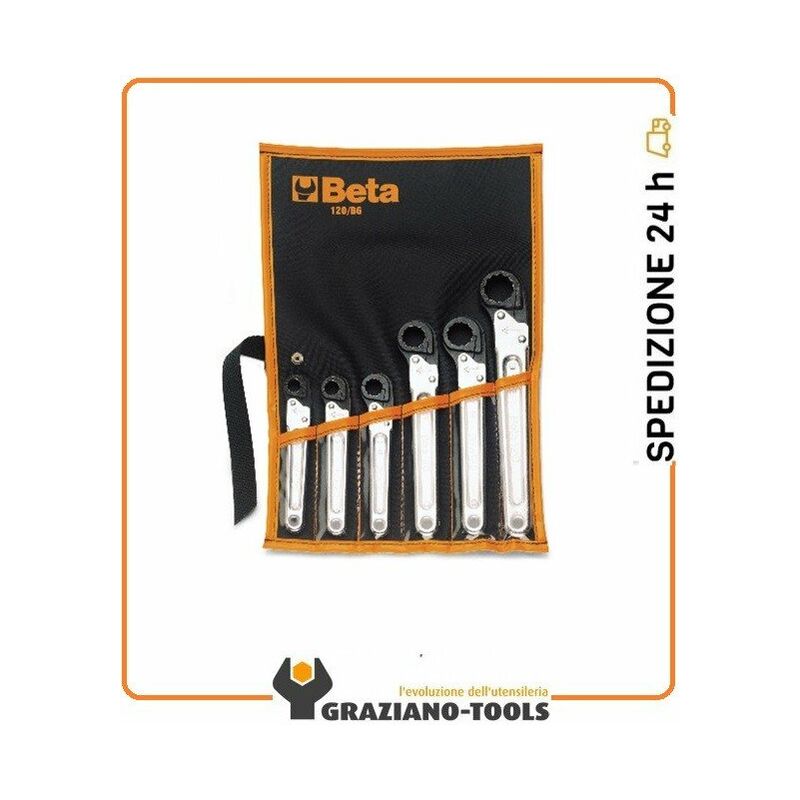 Serie di 6 chiavi poligonali aperte Beta a cricchetto (art. 120) In busta di tela Misure: 10-11-13-17-19-22 mm Peso: 900g