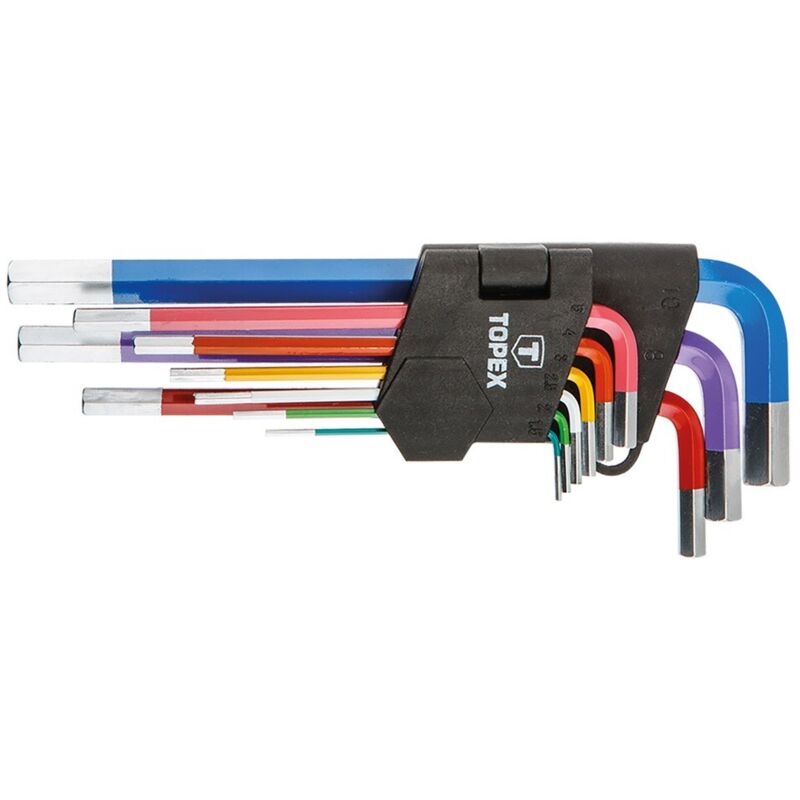Colorate. in acciaio al cromo vanadio, tipo lungo: lunghezza da 90 a 230 mm. raccolte in custodia plastica. misure 1,5-2-2,5-3-4-5-6-8-10.9 pezzi