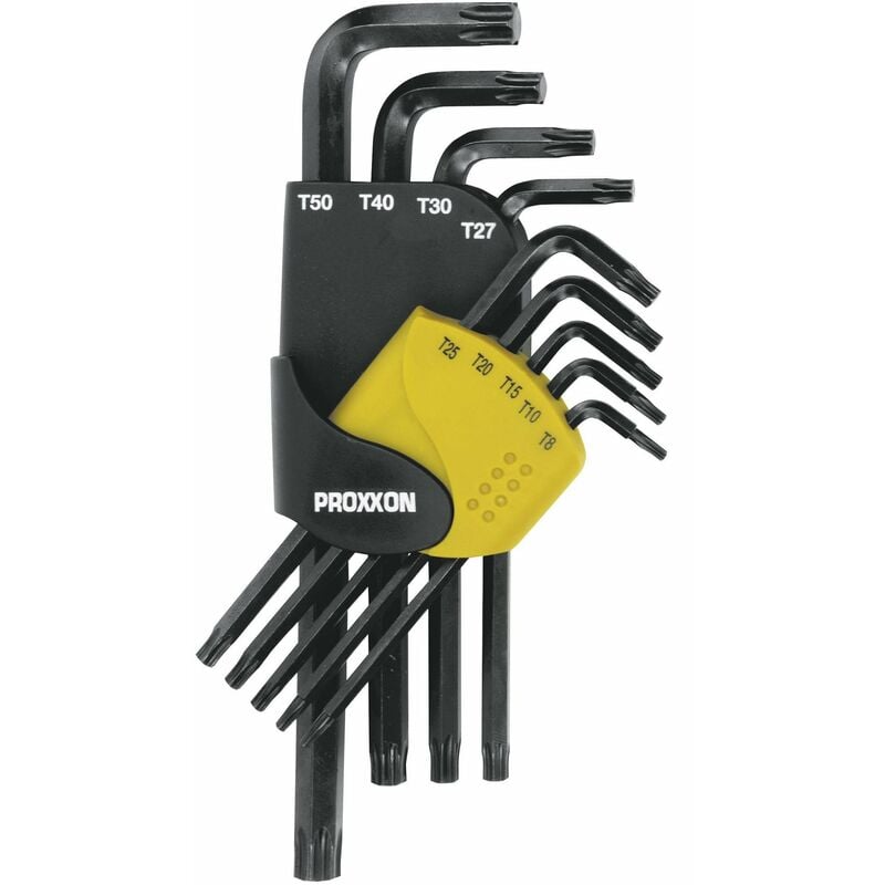 SERIE DI CHIAVI TORX ANGOLATE 8-50 MM 9 PZ PROXXON 23944: Misure TX: 8 - 10 - 15 - 20 - 25 - 27 - 30 - 40 e 50. In acciaio speciale legato al nickel-cromo-molibdeno. Pratico supporto a cerniera.