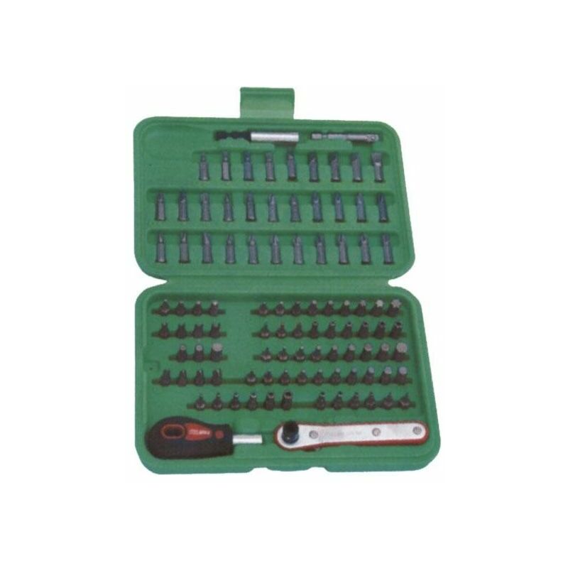 Assortimento Pezzi 99 bits e portainserti Dotazione: cricchetto, mini impugnatura magnetica, portainserti magnetico, portabussole 1/4'' Valigetta plastica