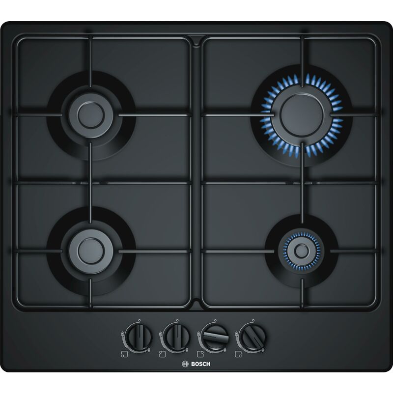 Piano cottura a gas smaltato Bosch PGP6B6B80 Serie 4 con comando frontale: le zone di cottura sono facilmente accessibili. Supporto smaltato: per la massima stabilità. Elegante design nero Potenza: 4 fuochi Anteriore sinistro: Bruciatore normale 1,75 kW Posteriore sinistro: Bruciatore normale 1,75 kW Posteriore destro: Bruciatore ad alta potenza 3 kW Anteriore destro: Bruciatore economy 1 kW Comfort / Sicurezza: accensione elettrica con una sola mano Sicurezza gas tramite termocoppia Facilità di pulizia Supporti smaltati. Gruppo di prodotti: piano cottura. Nome prodotto / famiglia: Table à interrup. camini a gas. Tipo di costruzione: Built-in. Tipo di controlli: meccanico. Sistema di controllo: impugnatura in diamante. Tipo di energia: gas. Efficienza energetica del piano cottura: 55.0. Quante zone di cottura possono essere utilizzate contemporaneamente: 4. Numero di bruciatori: 4. Numero di camini elettrici: 0. Numero di piastre in ghisa: 0. Numero di riscaldatori radianti: 0. Numero