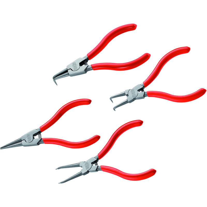 SERIE 4 PINZE PER ANELLI ELASTICI• Modello standard• Punte e becchi in corpo unico • Becchi conici per la massima accessibilità • Manici rivestiti in PVC • Esecuzione verniciata trasparente Codice Peso gr Q.tà x conf. U01270045 456 1