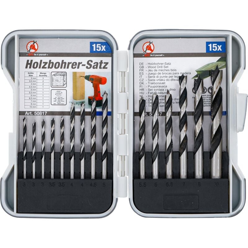 In cassetta di plastica Con punte di centratura Oggetto della fornitura 3 punte per legno Ø 3 mm 2 punte per legno Ø 3,5 mm 2 punte per legno Ø 4 mm 1 punta per legno Ø 4,5 mm 1 punta per legno Ø 5 mm 1 punta per legno Ø 5,5 mm 1 punta per legno Ø 6 mm 1 punta per legno Ø 6,5 mm 1 punta per legno Ø 7 mm 1 punta per legno Ø 8 mm 1 punta per legno Ø 10 mm