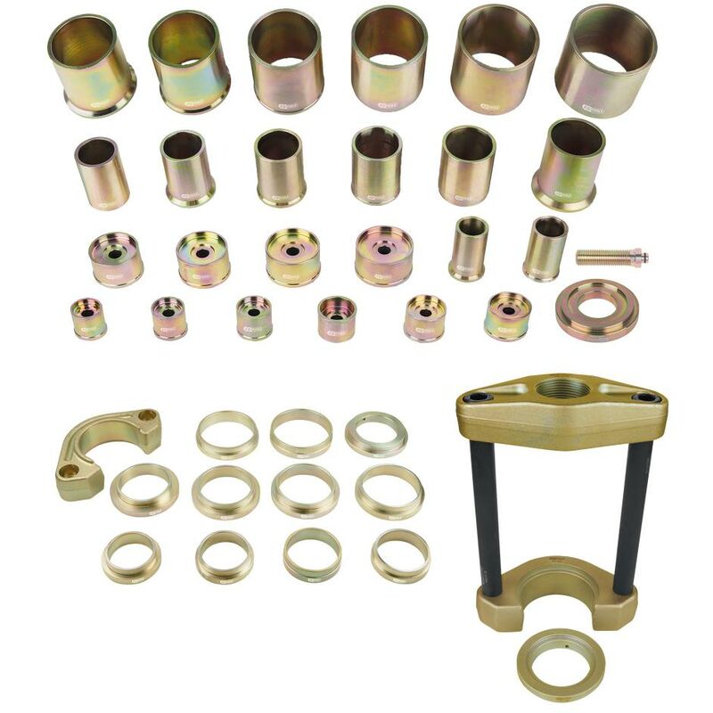 Dotazione ideale per il montaggio e lo smontaggio di cuscinetti, boccole e sospensioni 24 bussole a pressione con dimensioni diverse e 61 diametri interni e esterni diversi, compresi tra 30,5 mm e 79,7 mm 11 anelli a pressione con dimensioni diverse comprese tra 59,0 mm e 90,0 mm Con piastra cavalletto aperta e inserto anello adattatore Per un impiego direttamente sul veicolo Per l'utilizzo con cilindri idraulici Applicazione facile e sicura Impiego universale per autovetture e furgoni Acciaio speciale per utensili Cilindri idraulici consigliati: 14t (440.0015), 16t (440.0005), 22t (440.0010) Pezzi in set 47 Peso del tessuto 19710 Dimensioni dell'imballaggio 1 Materiale1 Spezial-Werkzeugstahl