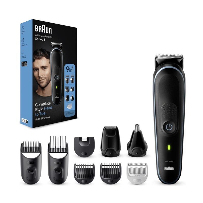 Braun Series 5 MGK5411 Kit Per Lo Styling. Colore del prodotto: Nero, Blu, Lunghezza minima del taglio: 1 mm, Lunghezza massima del taglio: 2,1 cm. Alimentazione: Batteria, Tempo di funzionamento: 100 min, Tipo batteria: Batteria integrata. Peso: 292,4 g, Peso della batteria: 18,6 g. Pettini: Barba, Corpo, Testina, Baffi, Naso. Larghezza imballo: 57 mm, Profondità imballo: 137 mm, Altezza imballo: 282 mm