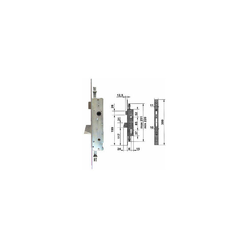 SERRATURA DA INFILARE PER MONTANTI Catenaccio Basculante. Scrocco reversibile e regolabile. Chiusura Triplice. Frontale in Acciaio Inox. Cilindro a Spillo. Due Copritoppe in nylon. Completa di due chiavi.