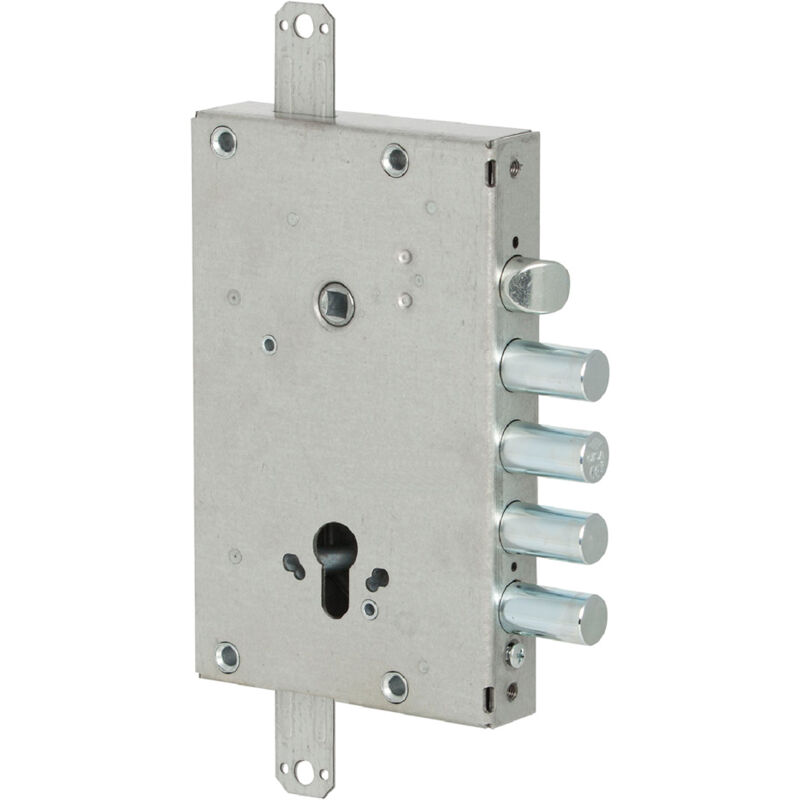 Cilindro europeo. Scrocco e catenaccio. Scatola in acciaio, scrocco e catenaccio in acciaio zincato ad alta resistenza. Fornita senza aste e senza cilindro.