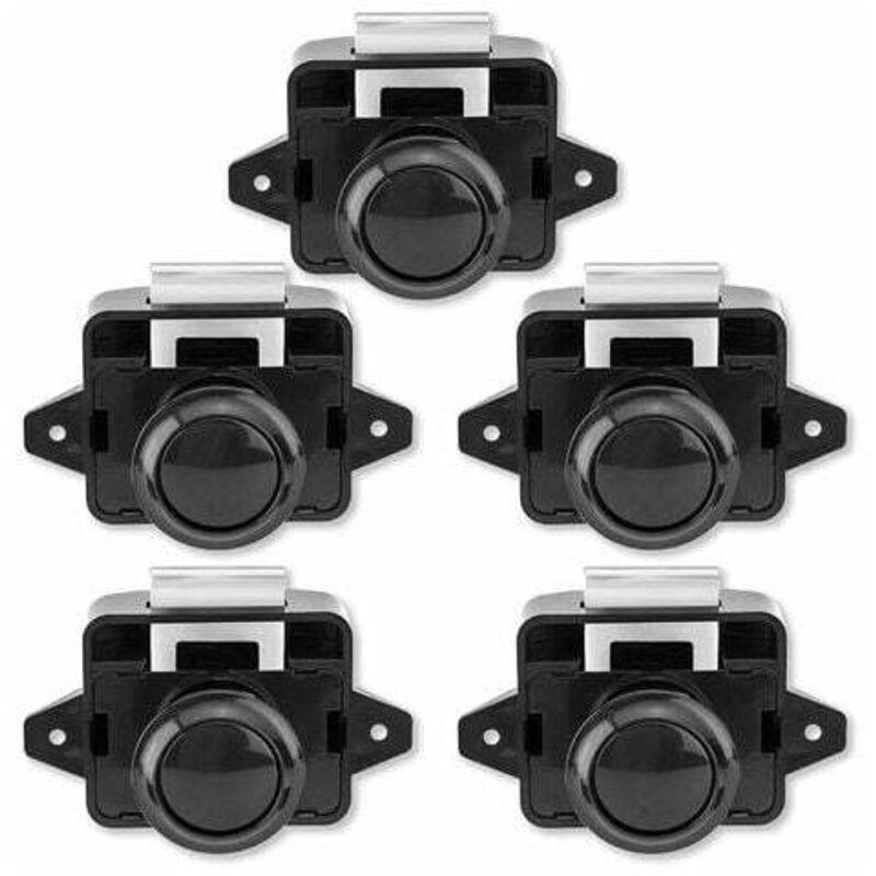 Prodotto Chiusura a pulsante con anello di bloccaggio della porta in metallo Per foro cassetto Φ26mm Spessore cassetto: 15-18mm Distanza foro serratura: 75 mm 36,19 mm Materiale: lega di zinco + plastica ABS Diametro del foro: 26 mm Spessore del pannello: da 15 a 18 mm Distanza tra i fori delle viti di bloccaggio circa 65 mm Distanza tra fori di riscontro circa 20 mm Dimensioni imballo: 116 mm x 87 mm x 9 mm Come installarlo? Praticare un foro di 26 mm di diametro nell'armadio;