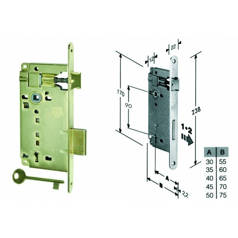 SERRATURA A BUSSOLA DA INFILARE BORDO TONDO OTTONATO - mm.35 bordo acciaio ottonato (591.35.03) scatola in acciaio lucido, quadro maniglia mm.8 dotazione 1 chiave - interasse mm.90 - frontale bordo tondo mm.22