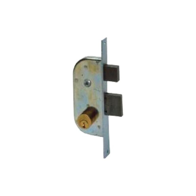 Serratura cancello infilare 42510 cisa (2 pezzi) B.q zinc f.mm 22 c.tondo m2+scr+q8 e.mm 50 con cilindro tondo. chiusura con catenaccio a 2 mandate e scrocco (lo scrocco e' azionato dalla chiave e dalla maniglia). quadro passante da mm. 8. frontale in acciaio zincato con bordo quadro da mm. 22x195. altezza scatola mm. 130. in dotazione: 3 chiavi piatte.