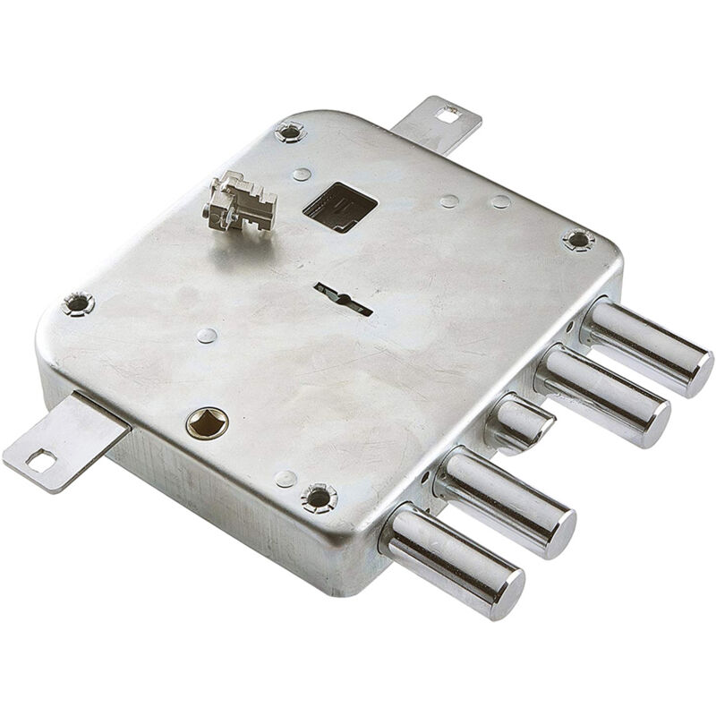 Triplice, con scrocco azionato da quadro maniglia mm 8 inferiore, 4 catenacci. Scatola mm 162x145. Corredata di 3 chiavi e blocchetto chiave di prova. Finitura zincata. Per porte blindate.